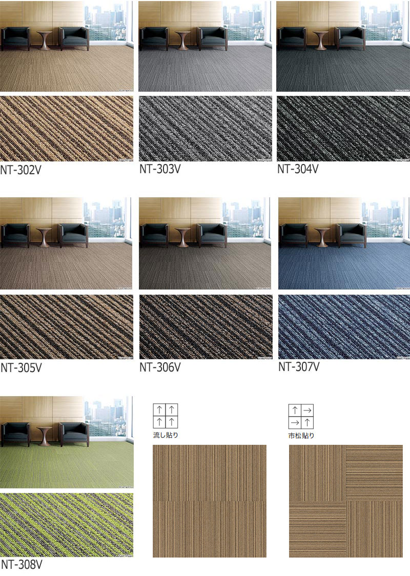 NT-303V・307V(流し貼り)VALUE LINE / バリューライン●サイズ:50cm×50cm●全厚:6.2mm(パイル長:3.5mmループ)●パイル組成:原着ポリプロピレン100%●パイル密度:1/10G×10.5ST●梱包(1ケース):20枚入り(5m2)●バッキング:リサイクルパウダー入りPVC+ガラス不織布●接着剤:ベンリダインGTS・NTR●制電性:1KV以下(JIS L 4406 23℃25%RH 合成ゴム底)●防炎試験番号:EO 060039在庫状況や返品などについてメーカー直送品のため、メーカーに在庫がなくなる次第、販売終了やお待ちいただく事があります。