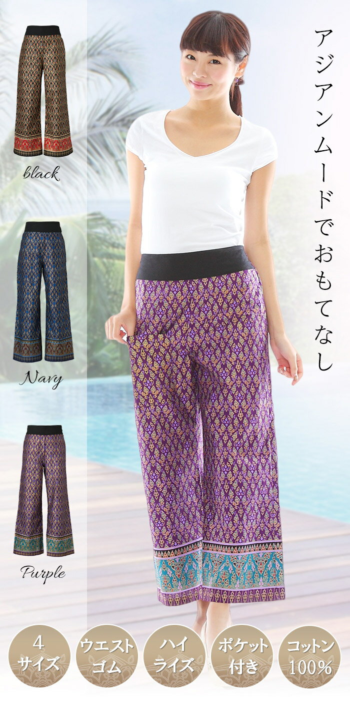 商品名選べる3color ゴージャス感満点 タイの伝統的柄ロングパンツ 素材綿100%サイズ7号 9号 11号 13号カラーブラック ネイビー パープル原産国タイおすすめポイント〇ラ・イムでしか買えない!作業の利便性に拘って作られたボトムス 〇後ろ股上が深い設計で、かがんだ時でも背中が出にくい! 〇お揃いの柄のトップスとコーディネートすると、より華やかな印象に♪
