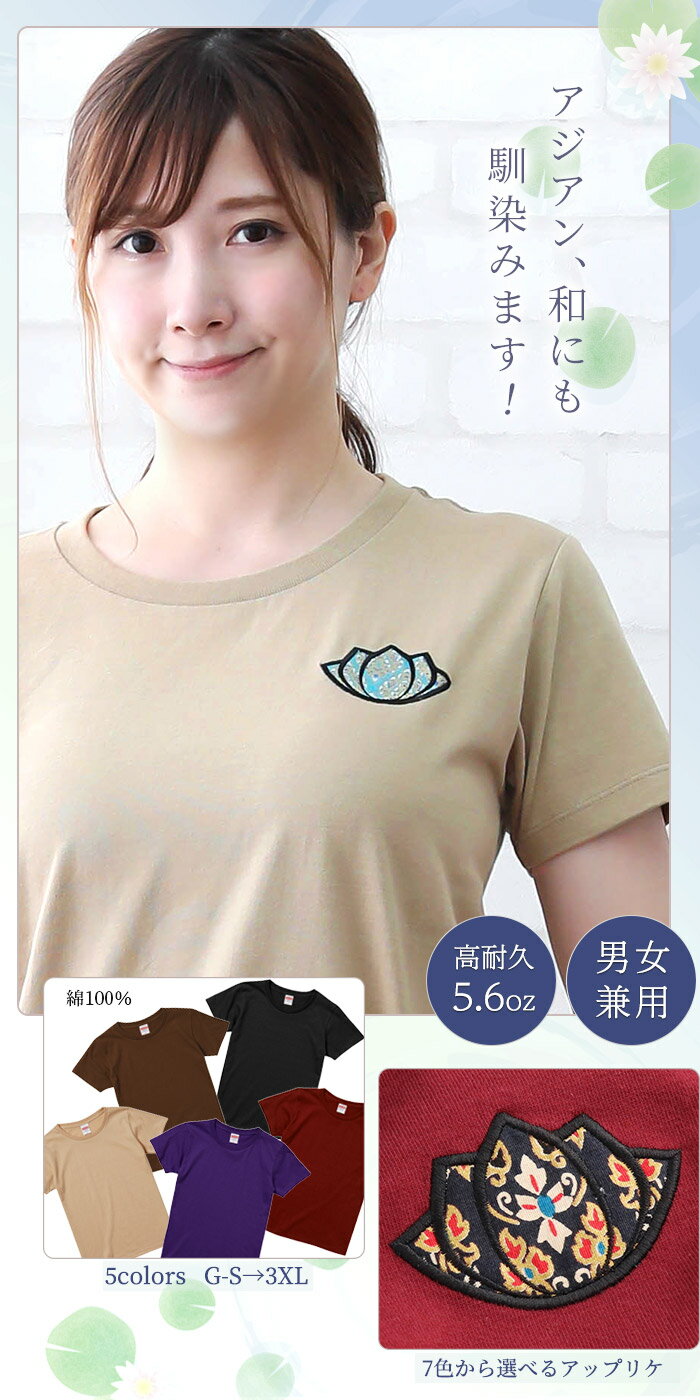 商品名和モダンなロータス!クルーネックTシャツ素材綿100%サイズG-S G-M G-L S M L XL XXL XXXLカラーワインレッド、ブラウン、ブラック、ベージュ、パープル原産国Tシャツ:中国 刺繍:日本おすすめポイント〇蓮の花とアジアンバティックのコンビネーションが素敵! 〇他には無い、当店オリジナルのアップリケ刺繍! 〇和の雰囲気、エスニックな雰囲気にもオススメです! 〇Tシャツ選びの重要なポイントとなる「よれない」「透けない」「長持ち」という3大要素をすべて兼ね備えたTシャツです。