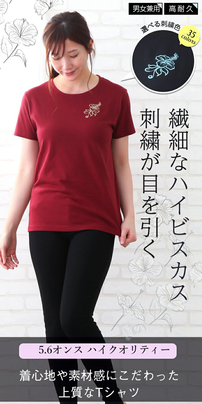 商品名繊細なハイビスカス刺繍入り クルーネックTシャツ素材綿100%サイズG-S G-M G-L S M L XL XXL XXXLカラーワインレッド、ブラウン、ブラック、ベージュ、パープル原産国Tシャツ:中国 刺繍:日本おすすめポイント〇当店独自の刺繍デザインで、南国ムードをより一層楽しめます! 〇店舗のイメージカラーと合わせてTシャツと刺繍糸colorを選べるのも魅力的。