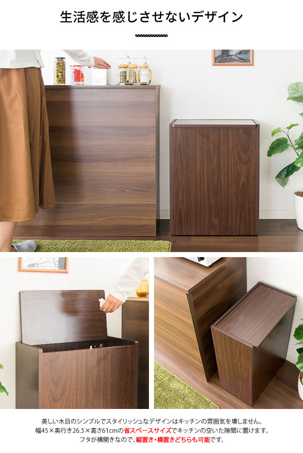 商品情報素材合成樹脂化粧パーティクルボード(塩化ビニル)組立式(約30分)、対応ポリ袋:45L幅45×奥行き26.5×高さ61cm(オープン時高さ:84cm) カラー:モニターの発色の具合によって実際の物と色が異なる場合があります。