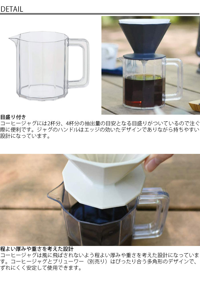 程よい厚みや重さを考えた設計 コーヒージャグとブリューワーはぴったり合う多角形のデザインで、ずれにくく安定して使用でき、風に飛ばされないよう程よい厚みや重さを考えた設計になっています。
